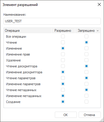 В данном окне отображается наименование выбранного субъекта безопасности и список детализированных прав для данного типа объектов. Для разрешения или запрета выполнения определенных действий над объектом установите соответствующие флажки напротив выбранных операций.