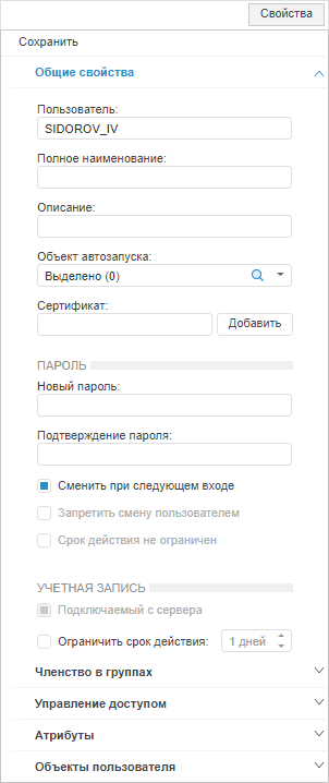 Будет отображена боковая панель «Свойства» для изменения свойств пользователя.