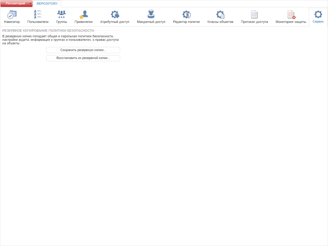 В группе «Резервное копирование политики безопасности» осуществляется работа с резервными копиями политики безопасности. В резервную копию попадает политика безопасности, настройки аудита, информация о группах и пользователях, о правах доступа на объекты. Операции по копированию и восстановлению политики безопасности протоколируются.