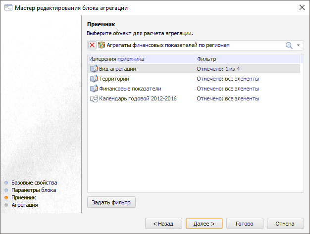 Для выбора элементов измерения, по которым будет рассчитываться блок, используйте диалог «Настройка фильтрации»: