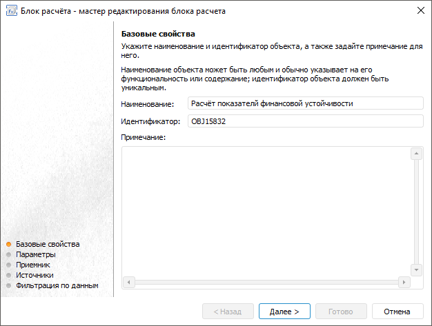 Настройка базовых свойств блока расчёта выполняется на странице «Базовые свойства» в мастере редактирования блока расчёта: