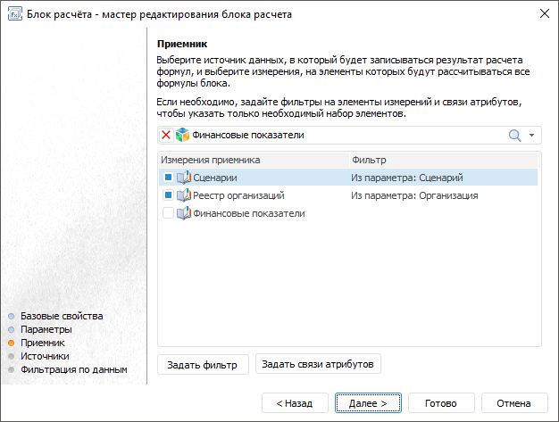 Выбор и настройка приёмника данных выполняется на странице «Приёмник» в мастере редактирования блока расчёта: