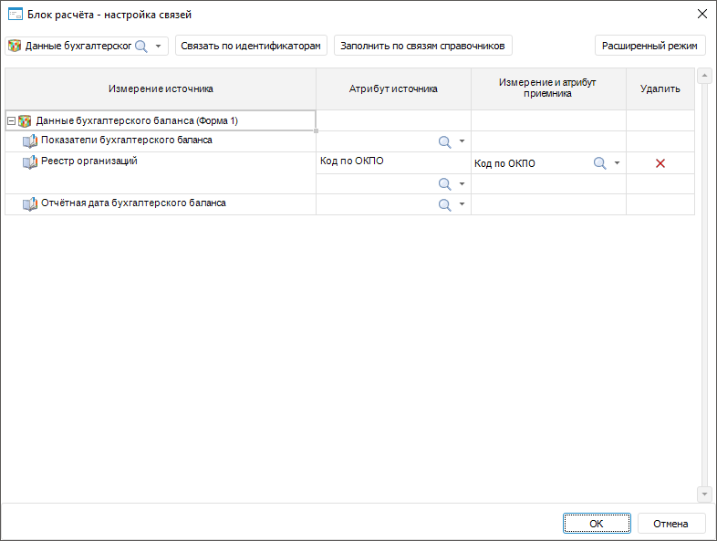 Для настройки связей измерений источника и приёмника данных используйте диалог «Настройка связей». Настроить связь можно разных режимах: упрощённом и расширенном. Вид диалога отличается в зависимости от режима настройки: