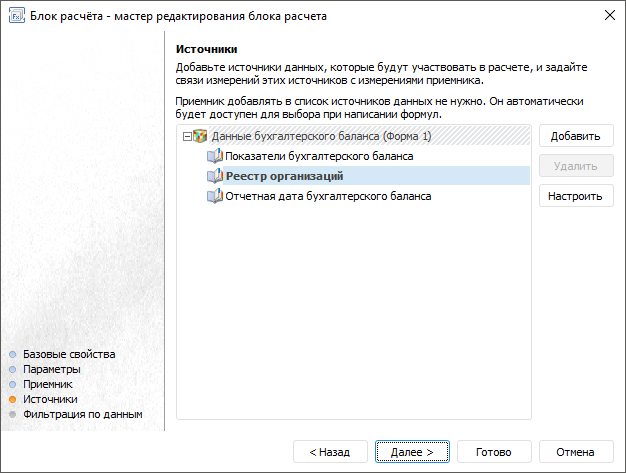 Выбор и настройка источников данных выполняется на странице «Источники» в мастере редактирования блока расчёта: