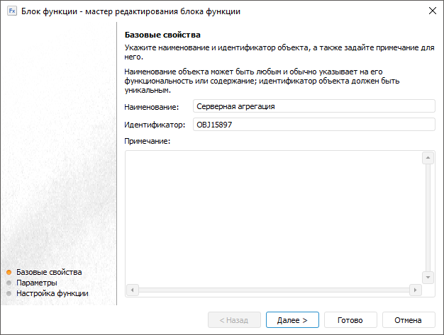Настройка базовых свойств блока функции выполняется на странице «Базовые свойства» в мастере редактирования блока функции: