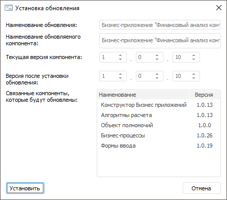 После выбора файла будет открыто окно «Установка обновления», в котором задайте версию компонента после установки обновления, затем нажмите кнопку «Установить»: