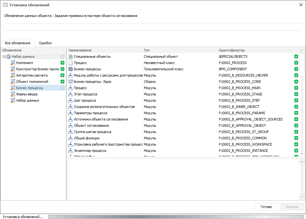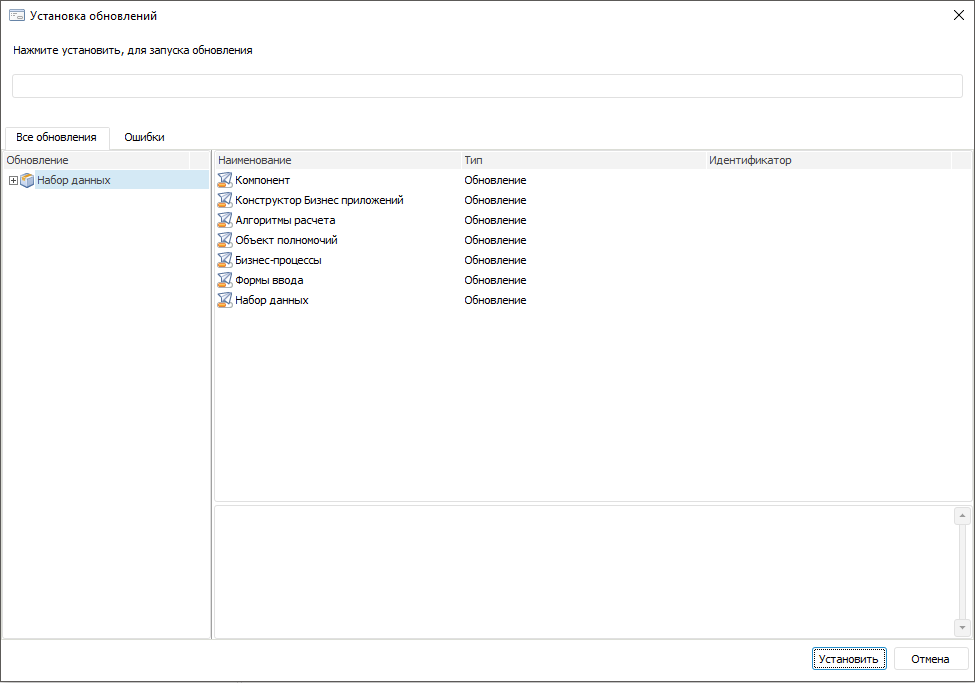 Для установки пакета обновлений компонента используется диалоговое окно «Установка обновления».