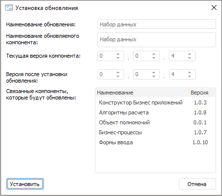 После выбора файла будет открыто окно «Установка обновления», в котором задайте версию компонента после установки обновления, затем нажмите кнопку «Установить»: