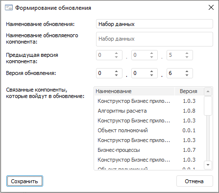 Для формирования обновления компонента используется диалоговое окно «Формирование обновления».