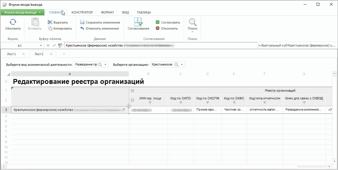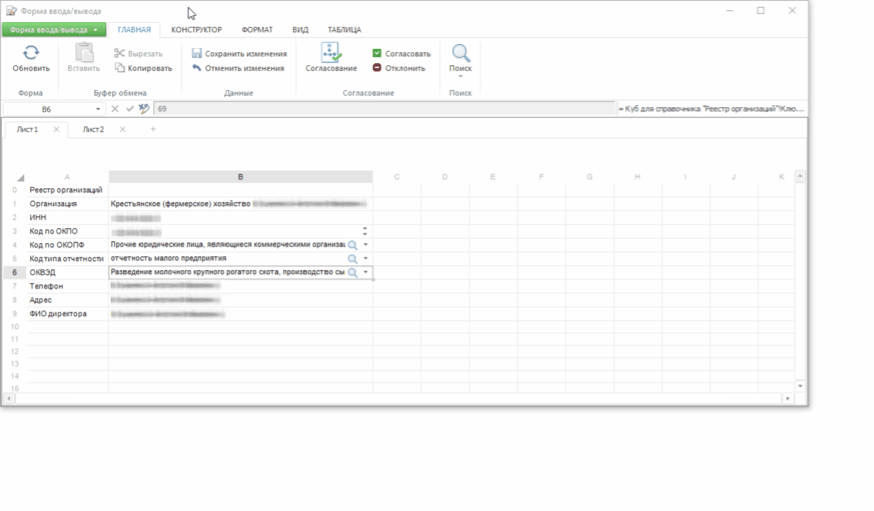 Реестровая форма. Представляет собой перечень элементов определенного типа, представленный в табличном виде. В первых столбцах, боковике формы, выводятся наименования элементов измерений, они могут быть расположены в иерархическом порядке. В первых строках, шапке формы, выводятся атрибуты и показатели элементов;