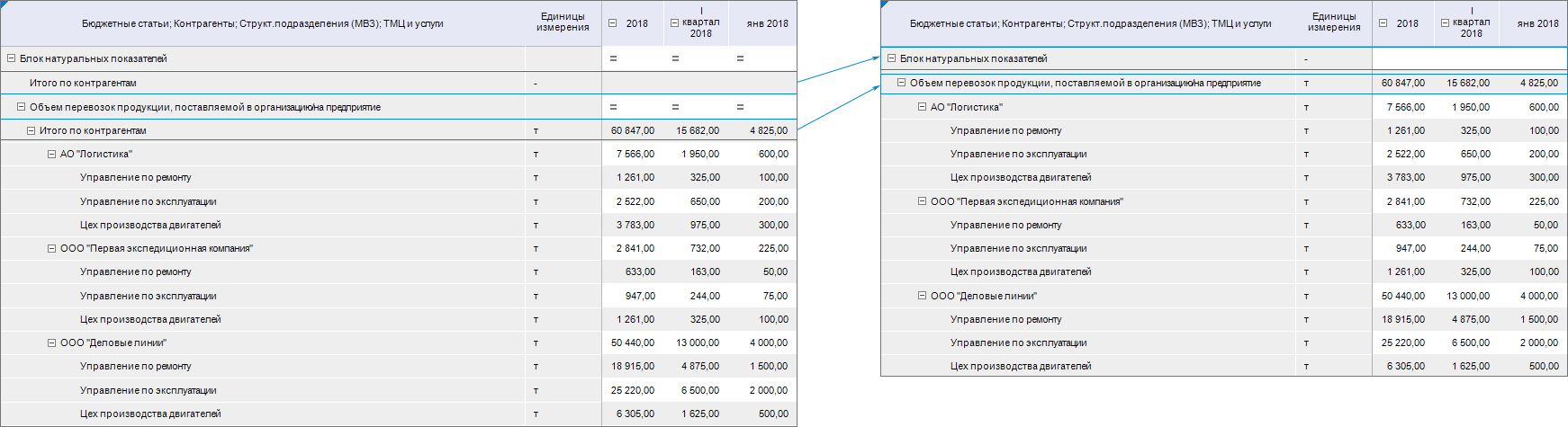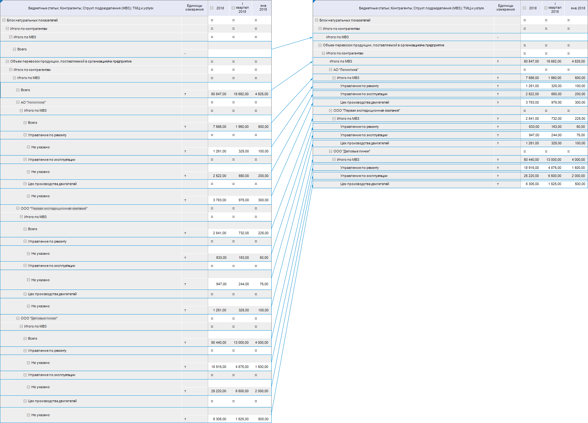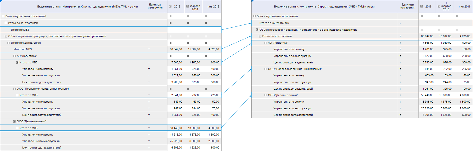 Для объединения элементов одного измерения с элементами другого используйте поджатие измерений. При использовании пожатия элемент измерения, который будет поджат, перестанет отображаться в отдельной строке, а его значения будут отображены в строке элемента измерения, к которому поджимают.