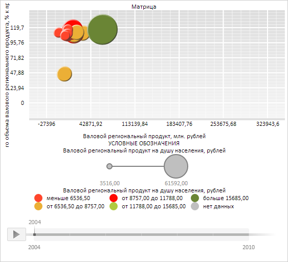 В результате выполнения примера для области пузырьковой диаграммы был указан заголовок «пузырьковая диаграмма» и нижний колонтитул с текстом «Условные обозначения»: