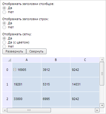 <body onselectstart="return false"> <div>Отображать заголовки столбцов:</div> <div id="coly"></div> <div id="coln"></div> <div style="padding-top: 10px;">Отображать заголовки строк:</div> <div id="rowy"></div> <div id="rown"></div> <div style="padding-top: 10px;">Отображать сетку:</div> <div id="gry"></div> <div id="gryc"></div> <div id="grn"></div> <!-- Кнопка «Развернуть» --> <div id="Button1" style="float: left;"></div> <!-- Кнопка «Свернуть» --> <div id="Button2"></div> <!-- Таблица --> <div id="table" style="padding-top: 10px;"></div> </body>