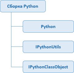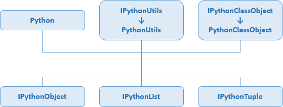 Ниже представлена иерархия наследования и взаимодействия различных классов и интерфейсов в сборке Python. Все названия классов/интерфейсов являются гиперссылками, для перехода к их описанию щелкните по ним мышью.