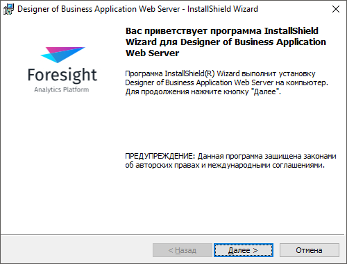 Для продолжения установки нажмите кнопку «Далее».