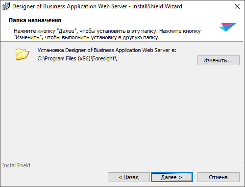 1. На следующем этапе установки необходимо определить папку, в которую будут установлены файлы серверной части. По умолчанию предлагается папка «C:\Program Files\Foresight\» или «C:\Program Files (x86)\Foresight\» при установке в x64 ОС. Для изменения папки нажмите кнопку «Изменить» В выбранной папке при установке будет создан подкаталог «Designer of Business Application Web Server».