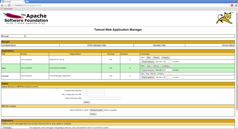 Установка серверной части выполняется с помощью файла DBA.war в консоли администрирования Apache Tomcat. Откройте консоль, используя следующий адрес: http://localhost:<port>, где <port> - порт, указанный при установке Apache Tomcat. Нажмите кнопку «Manager app», на запрос авторизации укажите учётные данные администратора.