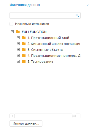 В качестве источников данных доступны кубы, дочерние кубы контейнера моделирования и базы данных временных рядов. Внешние источники данных могут быть добавлены с помощью мастера импорта данных.