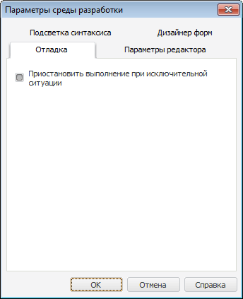 Данная вкладка содержит настройки, определяющие порядок поведения при возникновении исключительных ситуаций во время отладки пользовательской сборки/модуля/формы.
