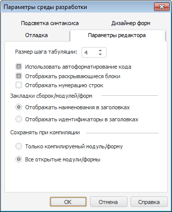 В области «Закладки сборок/модулей/форм» выбирается формат отображения вкладок открытых объектов среды разработки. По умолчанию в заголовках отображаются наименования открытых объектов;