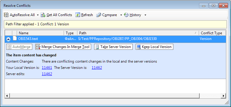 После нажатия кнопки «Check In» на сервере будут обновлены версии файлов, добавлена запись в историю изменений. При публикации могут возникнуть конфликты версий, если один и тот же объект был отредактирован разными пользователями. Данные конфликты решаются стандартными средствами VCS.