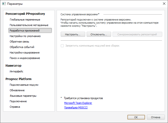 На данной вкладке осуществляется настройка репозитория для работы с Team Foundation Server (TFS). При нажатии кнопки «Подключить» появится окно для выбора сервера TFS: