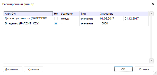 Фильтрация агрегируемых значений выполняется за счёт наложения условий на значения атрибутов измерения. Настройка выполняется в диалоге «Расширенный фильтр»: