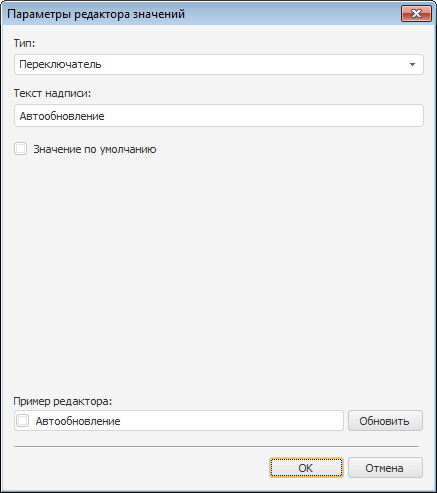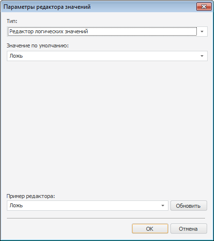 По аналогии с переключателем редактор логических значений принимает только 2 значения: «Истина» и «Ложь», однако выбор значения производится из раскрывающегося списка: