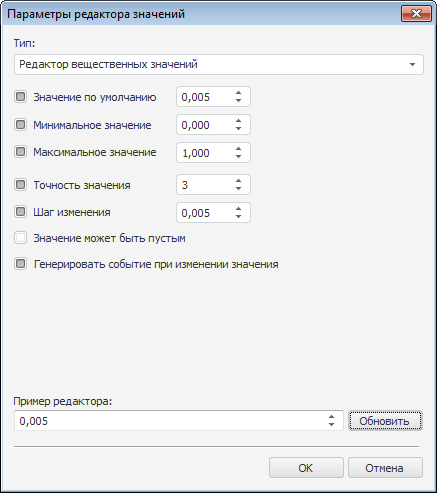 Редактор вещественных значений позволяет задавать значения вещественного типа с помощью поля ввода с кнопками прокрутки: