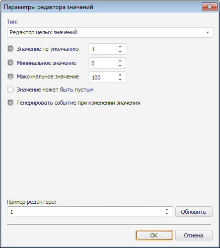 Редактор целых значений позволяет задавать целочисленные значения с помощью поля ввода с кнопками прокрутки: