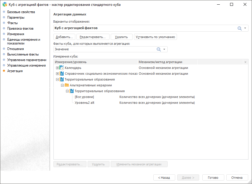 Настраивается для отдельного варианта отображения куба на странице «Агрегация» мастера создания стандартного или автоматического куба.