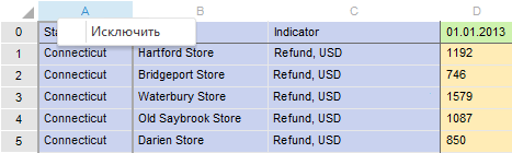 Корректировка диапазона осуществляется путем удаления строк и столбцов с ненужными данными. Для удаления столбца/строки выполните команду контекстного меню «Исключить» в области заголовка таблицы: