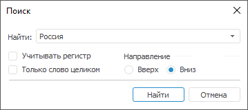 В поле «Найти» введите текст для поиска или выберите из раскрывающегося списка текст, который искали ранее. Если необходимо, задайте параметры «Учитывать регистр» для учета регистра символов и «Только слово целиком» для поиска текста, полностью совпадающего с введенным в поле. Выберите направление поиска, установив нужный флажок в группе «Направление».