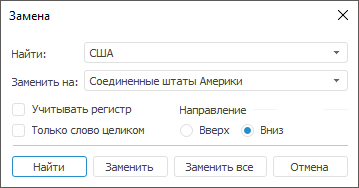 В поле «Найти» введите текст для поиска, в поле «Заменить на» введите текст, которым требуется заменить искомый текст. Доступна возможность выбора текста из раскрывающихся списков. Если необходимо, задайте параметры «Учитывать регистр» для учета регистра символов и «Только слово целиком» для поиска текста, полностью совпадающего с введенным в поле. Выберите направление поиска, установив нужный флажок в группе «Направление».