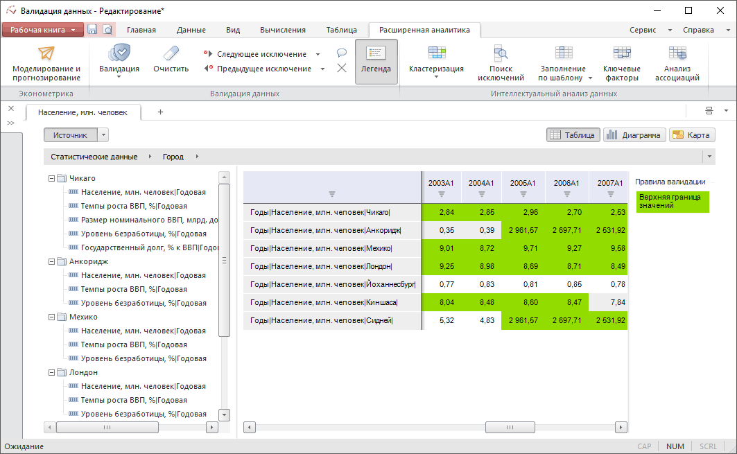 исключения выгружаются на новый лист, если правило валидации выполнялось в текущей БД временных рядов рабочей книги. Ряды, в которых содержатся исключения, доступны в дереве рядов нового листа. Дополнительно исключения сохраняются в виде дочернего объекта для правила валидации и доступны на вкладке боковой панели «Правила валидации». Формат наименования объекта: Запуск <дата и время запуска>. Например: Запуск 01.03.2018 15:45:00.