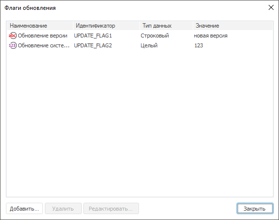 Для работы с флагами обновления выполните пункт главного меню «Обновление > Флаги обновления»: