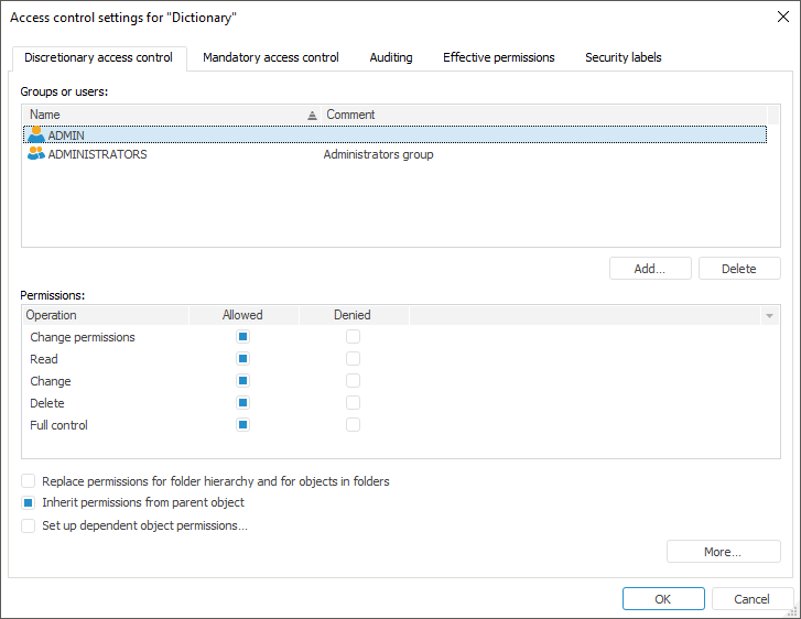 Access control settings provides a possibility to set up permissions of the specific object and object type.