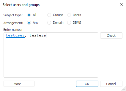 Select subject type, arrangement, and enter user names or groups to check subjects.