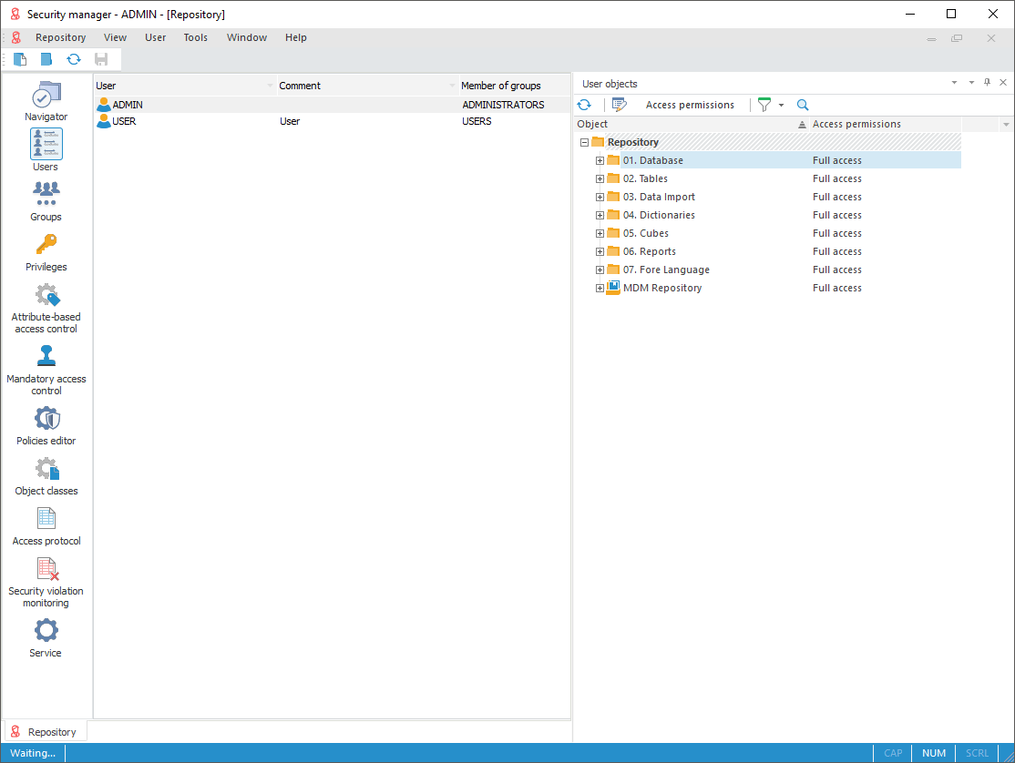 Users are security subjects of the system and have certain permissions to work with repository objects. Permissions can be obtained explicitly (if permissions are determined separately from users) and implicitly (if permissions are inherited from a group of users).