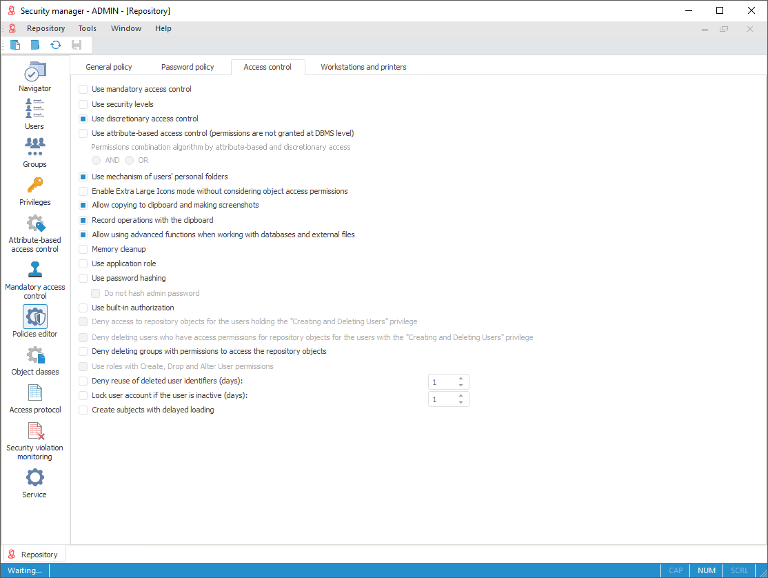 NOTE. The discretionary access control is set in the access control by default.