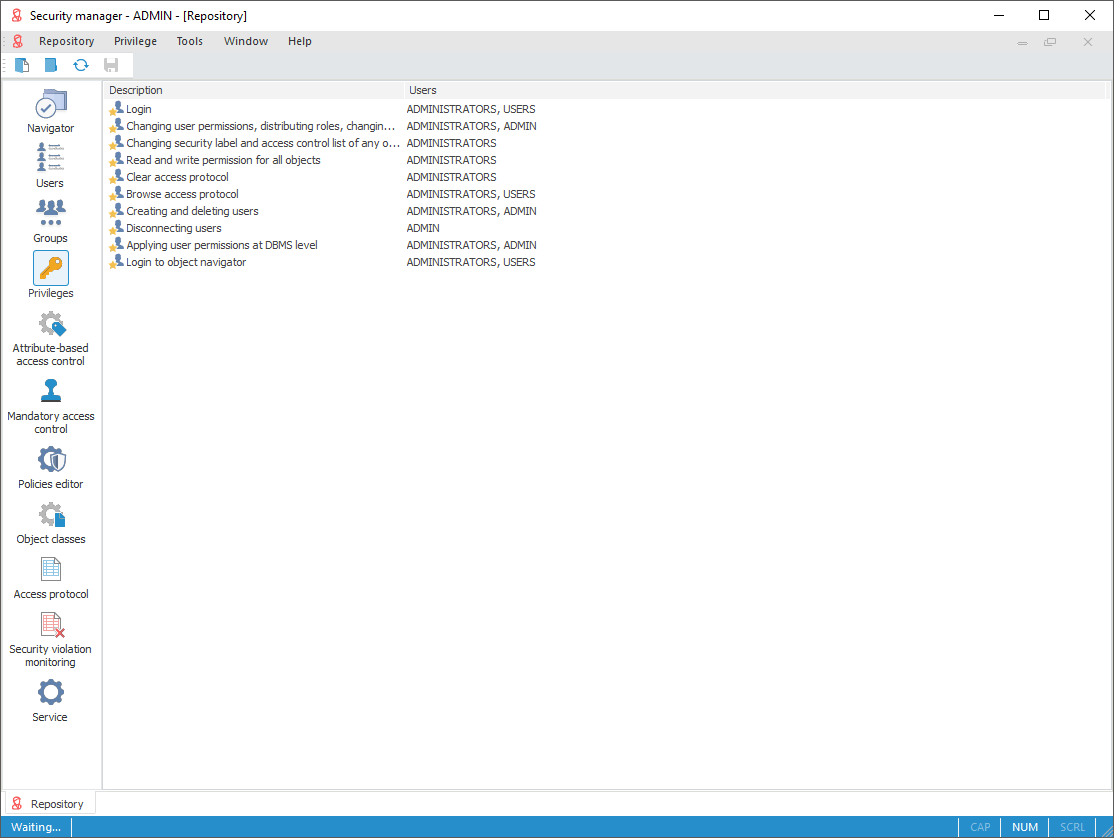 NOTE. The user who does not hold this privilege can open repository objects access permissions, for which he is granted.