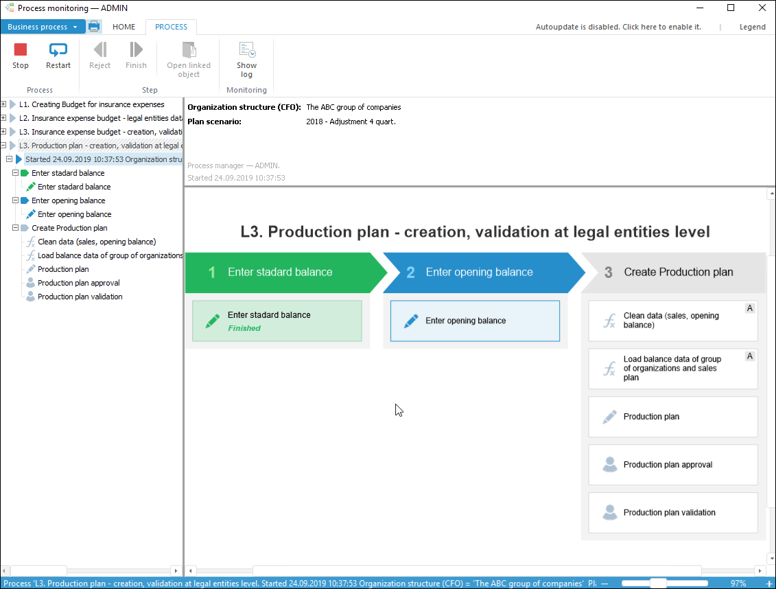 To start monitoring and process steps execution in the desktop application, use business process setup window, object navigator or business application.