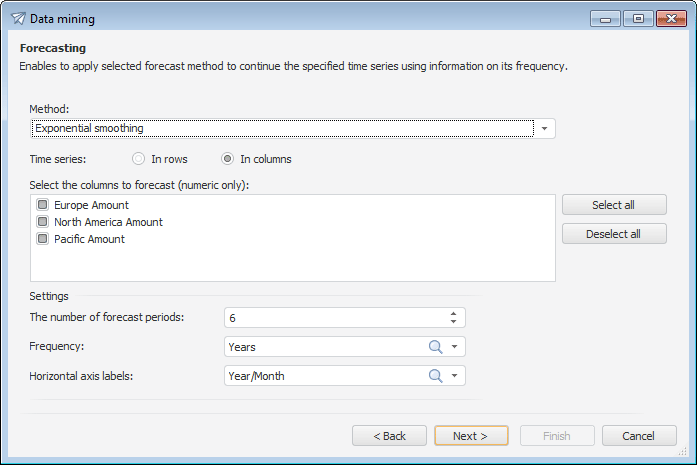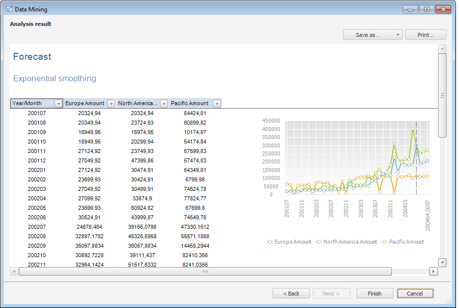 This type of analysis continues the specified time series by the selected forecasting method using information on its frequency.
