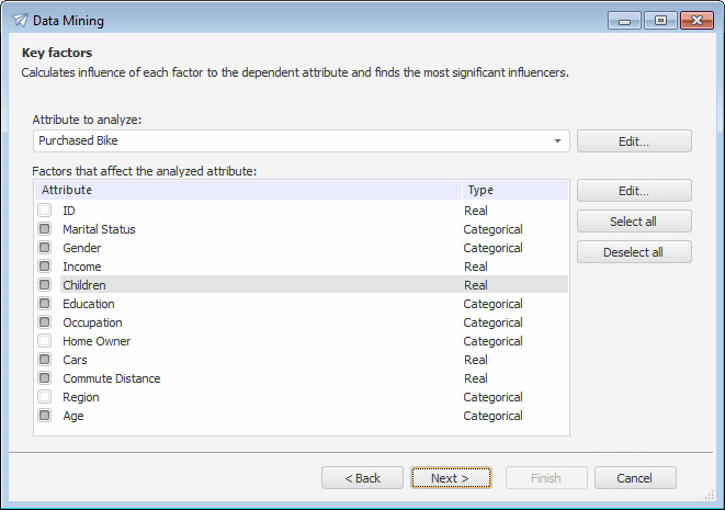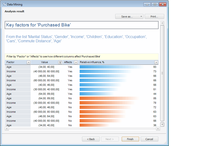 This type of analysis calculates a degree of influence of each factor on the dependent attribute and detects the most significant factors.