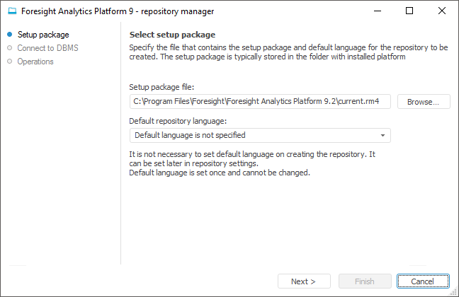 1. Installation Package File. To create a new repository, the path to the *.rm4 file that contains executable scripts is selected automatically. This file is included in the standard installation package and is located at S\Rm\current.rm4 path, where S is a path to the folder with installed Foresight Analytics Platform installation folder.