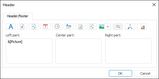 To edit header or footer, click the Set Up Header or Set Up Footer button. The header and footer editing dialog box opens: