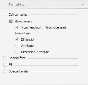 The contents displaying setup is available for the corner: custom text, dimension names and/or dimension attribute.