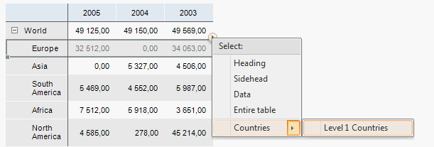 Names of the specified dimension will be selected in the table: