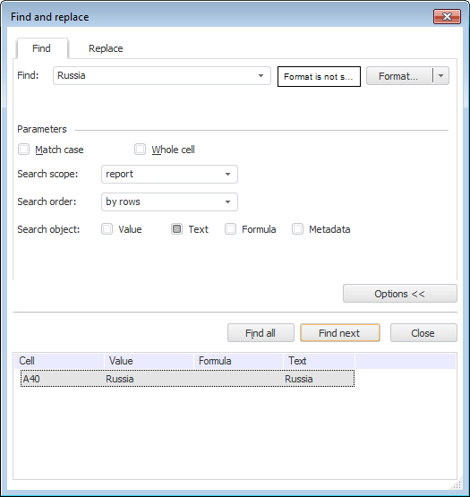 NOTE. Default search is executed in the entire report by rows, without accounting the format of searched cells and other parameters. Search is executed by value in the table cells.