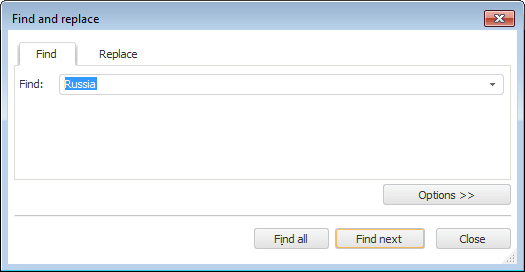 Click the Find or Find Next button to consequently navigate through the found table cells, or the Find All button to display all search results: